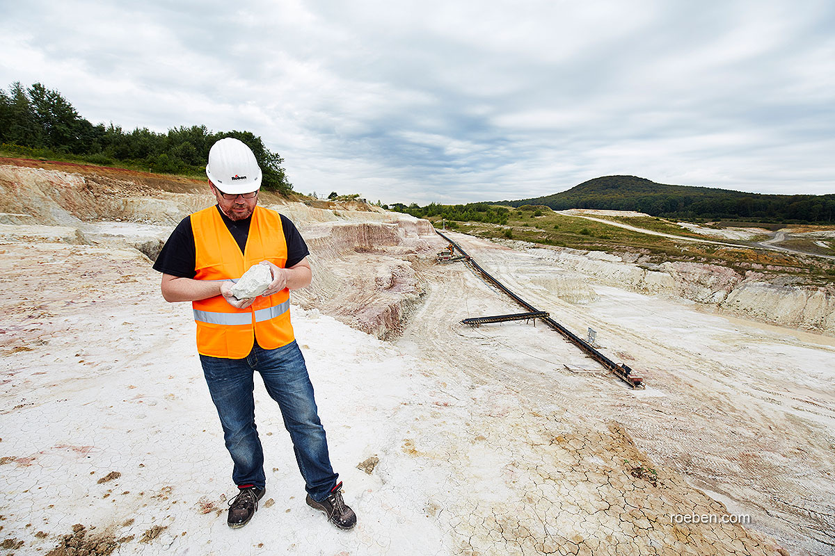 Unsere Rohstoffe für die berühmten weißen Keramik-Klinkerriemchen werden ausschließlich aus 25 bis 40 Millionen Jahre alten Tonen der 1. Sedimentationsphase im Westerwald gewonnen. Sie sind praktisch eisenfrei. Im Wesentlichen enthält der Röben-Ton die drei entscheidenden Mineralarten Kaolinit, Illit und Quarz. Das Kaolinit garantiert dabei – wie aus der Porzellanherstellung bekannt – das perfekte Weiß. Dank des Illits können die Keramik-Klinkerriemchen auf unter 3% Wasseraufnahme dicht gebrannt werden. Der Quarz schließlich liegt in der freien kristallinen Form zum Teil sehr fein und ungewöhnlich sauber vor, praktisch ohne farbliche Einschlüsse – ebenfalls eine Voraussetzung für perlweiße Klinker.