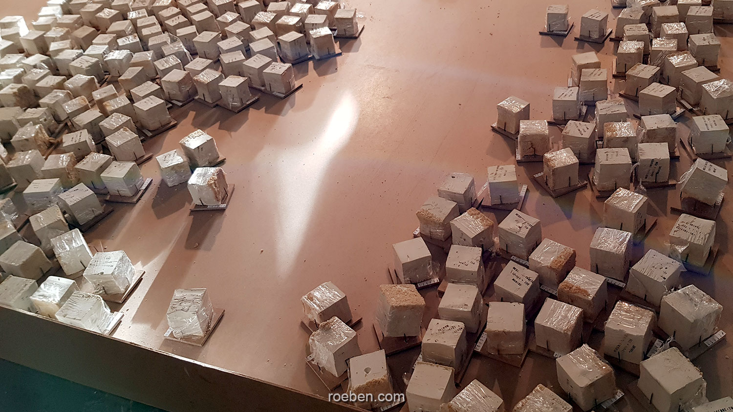 An drei Arbeitsplätzen wurden jeweils zwei Arbeitsschritte ausgeführt. Der Fokus lag nicht auf einem gestalterischen Bearbeiten, sondern einer maschinellen Fertigung. Die insgesamt sechs Arbeitsschritte wurden an den Tonwürfeln in jeder möglichen Reihenfolge durchgeführt werden. Dies ergab 720 verschiedene Reihenfolgen der sechs Arbeitsschritte. So wurde gebohrt, beklebt, umwickelt, gestanzt, bestempelt und verformt. Wichtig war den Künster*innen, dass jeder Arbeitsschritt sichtbaren Einfluss auf den Tonwürfel nimmt, so dass die Änderungen der Reihenfolge der Arbeitsschritte sichtbar wurde.