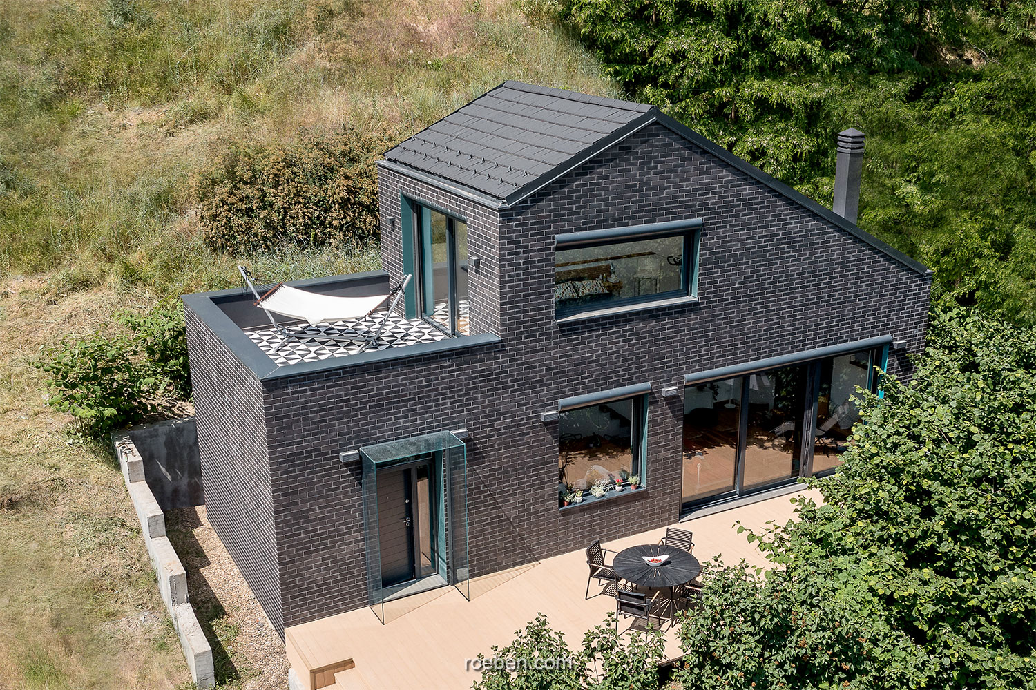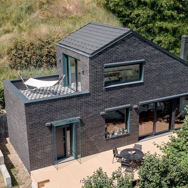 Foto © Miloš MartinovićMit unserem Klinker BRIGHTON und dem Flachziegel BERGAMO in der Farbe Anthrazit hat Architektin Milena Zindović von MZ STUDIO ARCHITECTURE im serbischen Grocka auf einer Grundfläche von nur 45 m² dieses Wochenendhaus erstellt. Das Hanggrundstück mit herrlichem Blick auf die Donau war zuvor bereits bebaut, so dass sich der Neubau an der Grundrissgröße des Altbaus orientiert.