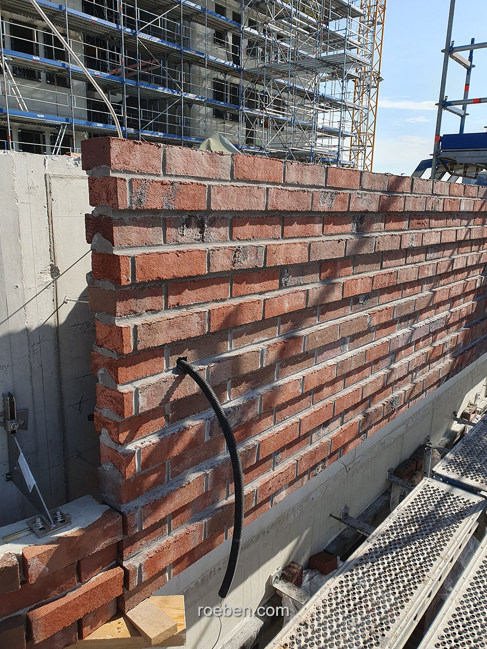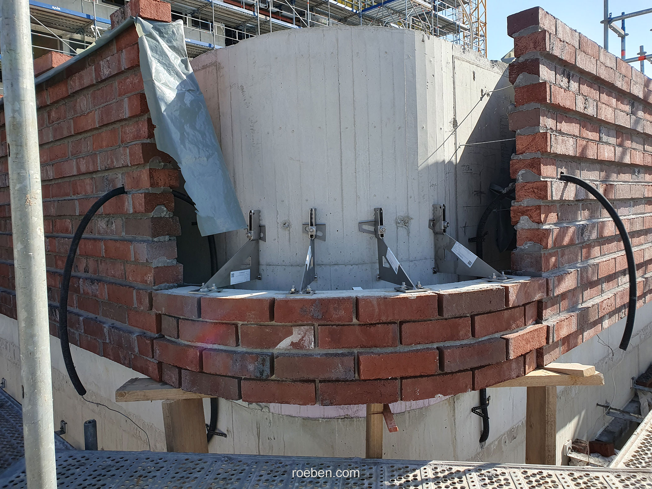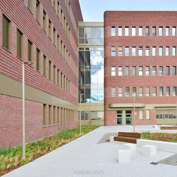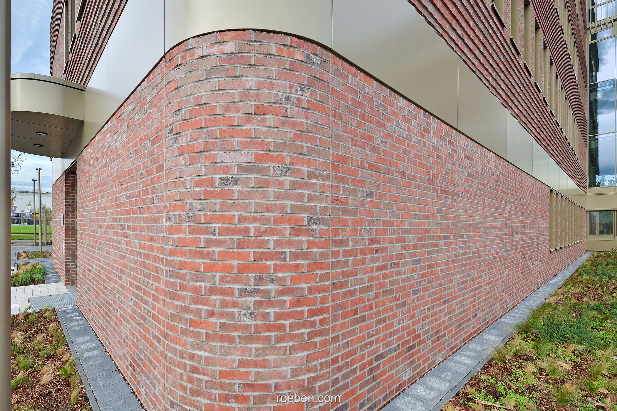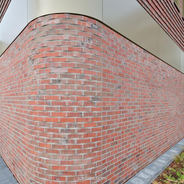 Eine besondere Herausforderung war die Umsetzung der abgerundeten bzw. auskragenden Gebäudeecken. Hier wurden Fertigteile eingesetzt, die das auf ihnen konventionell erstellte Mauerwerk geschossweise abfangen. Eingearbeitet waren dabei bereits die Klinkerbänder, die sich im fortlaufenden Mauerwerk in jeder zweiten Reihe aus 25 Millimeter hervorstehenden Klinkern finden. Auch sämtliche Fensterstürze sowie die Überdeckungen der Öffnungen des Sichtmauerwerks im Innenbereich wurden als Fertigteile geliefert; denn die kraftvolle Materialwirkung mit dem robusten Klinker wird im Gebäudeinneren fortgeführt und gewährleistet so eine durchgängige Gestaltsprache mit fließendem Übergang. Insgesamt hat Röben 364 Ziegelfertigteile geplant, gefertigt und zur Baustelle geliefert.