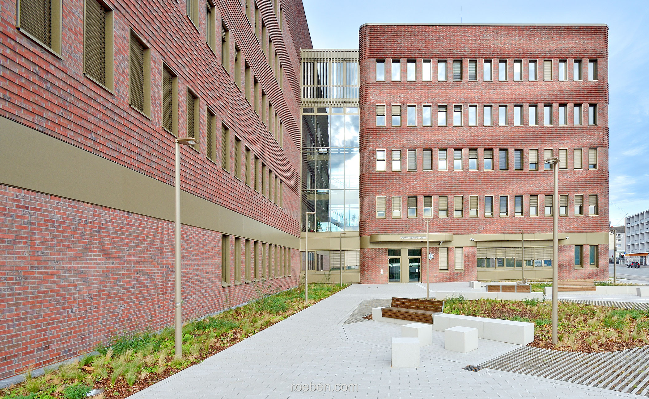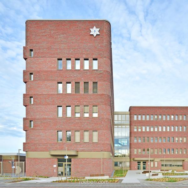 Foto © RöbenDer Bremerhavener Stadtteil Geestemünde hat ein neues Polizeigebäude erhalten. Der sechsgeschossige Entwurf des Bremer Architekturbüros Haslob, Kruse und Partner zeichnet sich durch seine markante Formensprache aus und überrascht mit feinen Details in der Klinkerfassade. Handstrichverblender WIESMOOR rotblau-bunt.