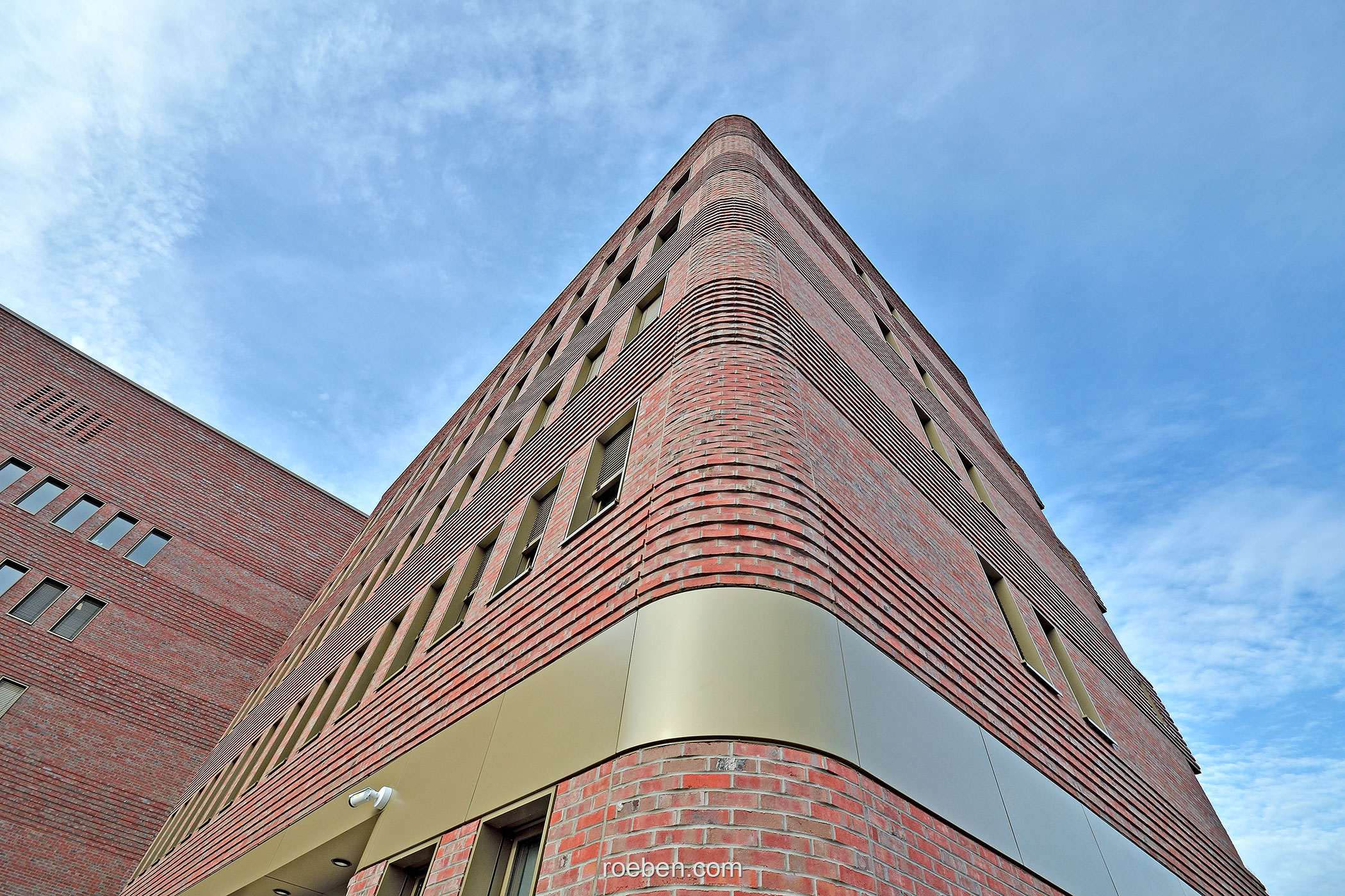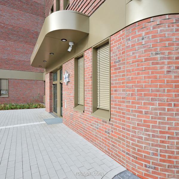 Ein weiteres prägnantes Detail des Entwurfs sind die horizontal umlaufenden, aus Reliefs gebildeten Klinkerbänder, die dem Ensemble seine dynamische Form verleihen und zugleich seine Adresse an der belebten Kreuzung betonen. Zusätzlich akzentuiert wird die horizontale Gliederung durch die streng symmetrisch platzierten, dabei bronzefarben eingefassten Aluminiumfenster sowie ein ebenfalls bronzefarbenes Metallband, das die Bauteile umschließt und dabei auch die Vordächer bildet, mit denen die Eingänge betont werden.
