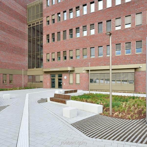 Komplettiert wird der Entwurf durch einen kleinen Stadtplatz vor dem Gebäude, der Passanten als Aufenthaltsbereich dient. Zudem steht eine Carport-Anlage für Einsatzfahrzeuge zur Verfügung. Die Flachdächer sind extensiv begrünt und mit einer Photovoltaikanlage ausgestattet, auf dem eingeschossigen Gebäudeteil bietet eine begrünte Dachterrasse zusätzlichen Freiraum. Mit seiner optimierten Dämmung und der geothermischen Nutzung des Untergrundes mittels Erdsonden zur CO2-neutralen Beheizung ist der Neubau das bundesweit erste Polizeirevier, das sich vollständig klimaneutral mit regenerativer Energie betreiben lässt.